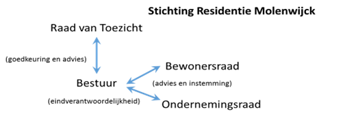 Stichting Residentie Molenwijck wordt bestuurd door een directeur-bestuurder die voor instemming en advies, afhankelijk van het onderwerp, afstemming zoekt met de Bewonersraad en/of de Ondernemingsraad en voor goedkeuring en advies terecht kan bij de Raad van Toezicht. Gezamenlijk geven de vier raden richting aan beleid en strategie.